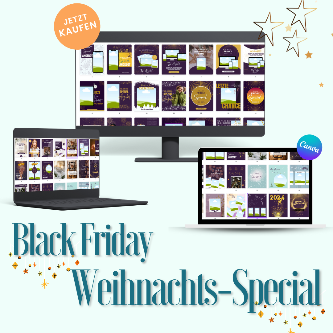 Steigere deinen Umsatz und beende 2024 mit einem Knall! Für nur 9€ erhältst du Zugang zu meinen exklusiven 50 Black Friday / Weihnachts-Special Canva Templates.